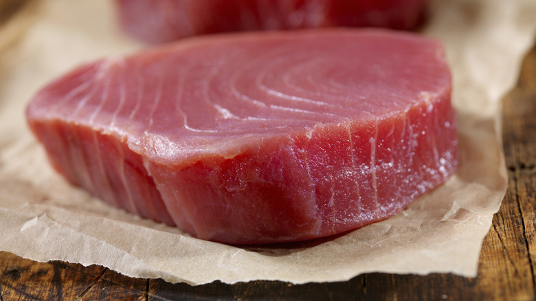 Swordfish is a popular choice for seafood lovers, but picking a fresh cut requires a keen eye. According to Robert DiGregorio, "When shopping for swordfish, it's important to look out for a tight red bloodline, and no green around the skin." The bloodline — the dark red streak running through the fillet– should be a deep, rich red. The fish is likely past its prime if it appears brown or dull. If you're unsure, your best bet is to pass on anything that looks iffy.