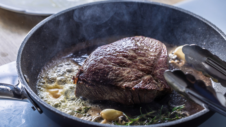 Instead, it turns out that the fastest way to thaw a steak is to not thaw it at all. Tuchscherer explains that you should use the reverse sear method and start by "setting your oven to its lowest temperature and placing your steak on a rack on a baking sheet. Once your steak reaches 115 [degrees Fahrenheit], pull and place in a cast iron skillet to sear and form a crust for 60-90 seconds on each side." Overall, it's pretty similar to a typical reverse seared steak recipe, so once you know what to do, you can cook from a thawed steak anytime you need to.
