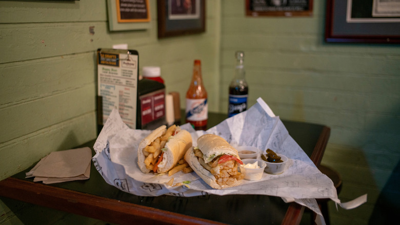 Part of the appeal of the po-boy during this time was the size of the sandwich itself. A 15-inch standard po-boy would cost only 10 cents, while a 20-inch half-loaf sandwich was 15 cents. For comparison's sake, that's almost twice the size of a footlong sub from Subway — and it would cost you just $2.85 when adjusted for inflation. Not bad, right? Especially for a sandwich that was practically bulging with ingredients. For folks who were even more strapped for cash, the Martin brothers also offered a lettuce and tomato sandwich, which was on their menu for free. Talk about generosity in a time of need.