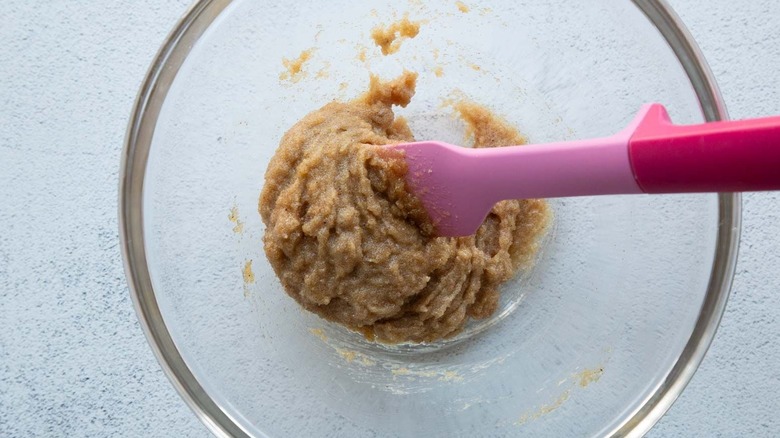- In a large bowl, mix the brown butter with the brown sugar until combined.