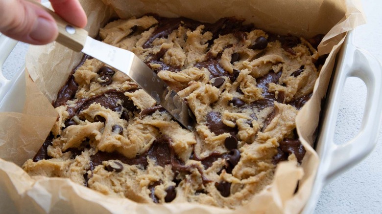 Use a knife or offset spatula to gently swirl the cookie dough into the brownie batter.