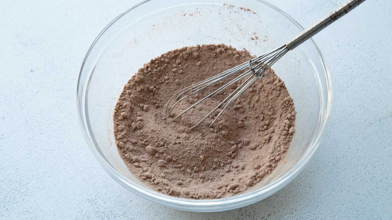 - In a large bowl, whisk together the sugar, cocoa powder, flour, and salt.