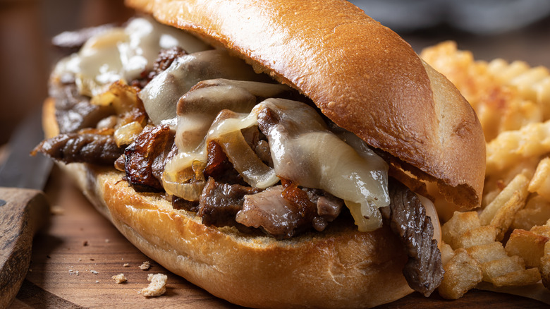 Most Philly cheesesteaks come with fries. It's a classic pairing that this upgrade further merges — just throw those fries on top of your cheesesteak instead of eating them on the side. Doing so creates a whole new layer of flavor and adds textural interest. Make sure to spread the fries across your roll instead of just dumping them in the center. Not only does this ensure you get some fry in every bite, but it also stays on the sandwich better.