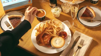 The chain Swiss Chalet has been roasting chickens over fire since 1954. The original location, in Toronto, started with a traditional Swiss design. This emphasized the brand's Swiss-roasted chicken, a type of rotisserie in which birds are roasted on a spit, over an open flame. Nowadays, the menu also includes seafood, pierogis, spring rolls, soup, salad, and poutine.