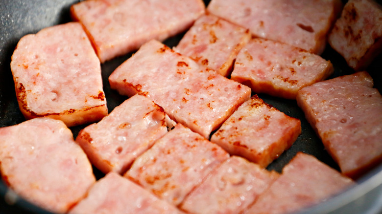 Plus, it's useful to remember that Spam is a slightly more playful product than canned ham. Spam can come in some pretty interesting flavors, with a Hot & Spicy version, a Korean BBQ-infused style, and even a Pumpkin Spice Spam. We know, we don't really wanna try that last one either — but our point is that you'd be hard-pressed to find your typical canned ham with these same additions.