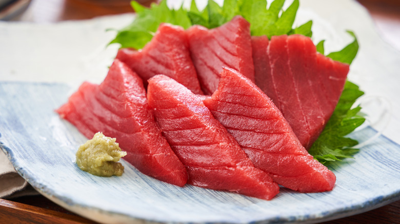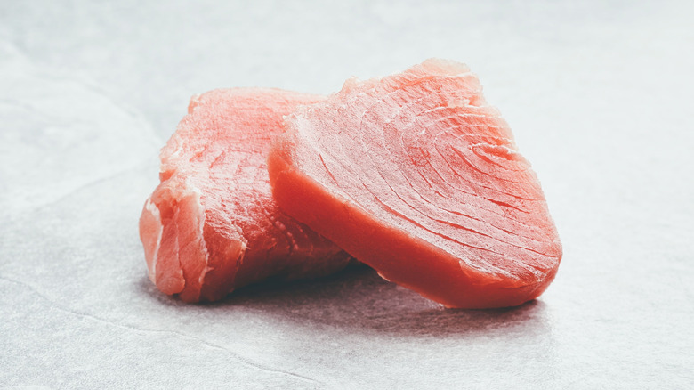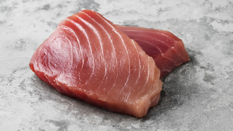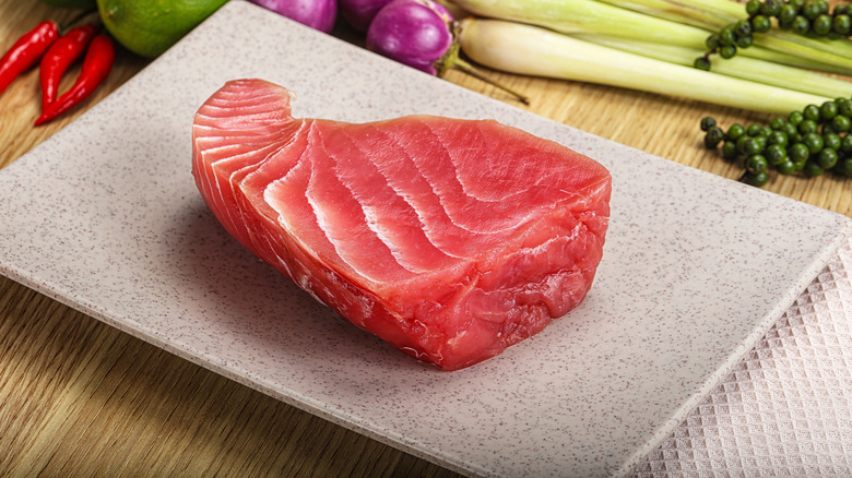 You'll want to make sure you're still adding flavor to your tuna, though. If you're going for ahi tuna poke, sprinkle it with a savory soy sauce, sesame oil, and green onions, to brighten up its taste without overwhelming it. It's also important to choose your tuna steak very carefully if you're planning to serve it raw. Tuna described as "sushi-grade" or "sashimi-grade" may seem comforting, but these terms aren't defined by any rigorous national body — they merely mean that the seller has decided that this fish is safe enough to eat raw. Therefore, if you're buying sushi-grade or sashimi-grade tuna, the important thing to judge is how trustworthy the seller is, how fresh the fish is, and how they're treating it to avoid cross-contamination.