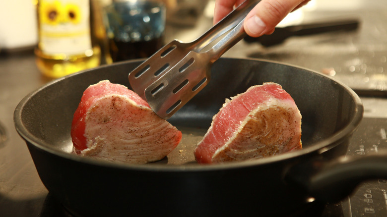 The art of the sear is a delicate one, and it's something that a lot of people get wrong with their tuna steaks. People tend to do a combination of two things: They don't get their pans hot enough, and then they sear the meat for longer than it needs. Doing this causes the steak to cook right through to its center, which is the last thing you want, as it will turn what could be a melt-in-your-mouth piece of fish into one that's tough and rubbery.