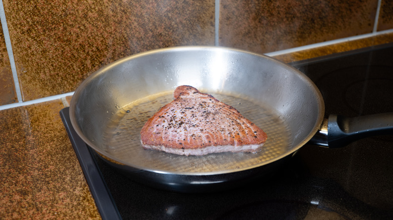 Tuna steaks are also notoriously easy to treat poorly before cooking, which results in your meal being way off the mark. By forgetting to pat your tuna dry (or, alternatively, making it even more wet by washing it), you end up inadvertently boiling or steaming the meat and ruining any chance of it developing a brown, crispy crust. The wrong temperature can also result in your tuna steak being under- or overcooked, with both the heat of your pan and the meat itself affecting your sear. This deluxe fish cut shouldn't go to waste, so we decided to banish all these mistakes once and for all.