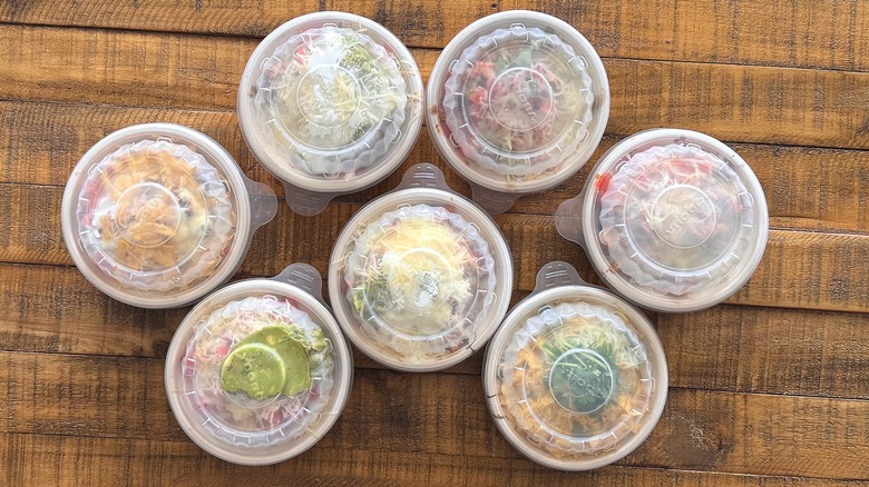 I grabbed a variety of mini bowls from Qdoba, each featuring one of the seven proteins. I opted for toppings that fit with the flavor profile of the seasoning/protein in question to ensure a balanced bite.