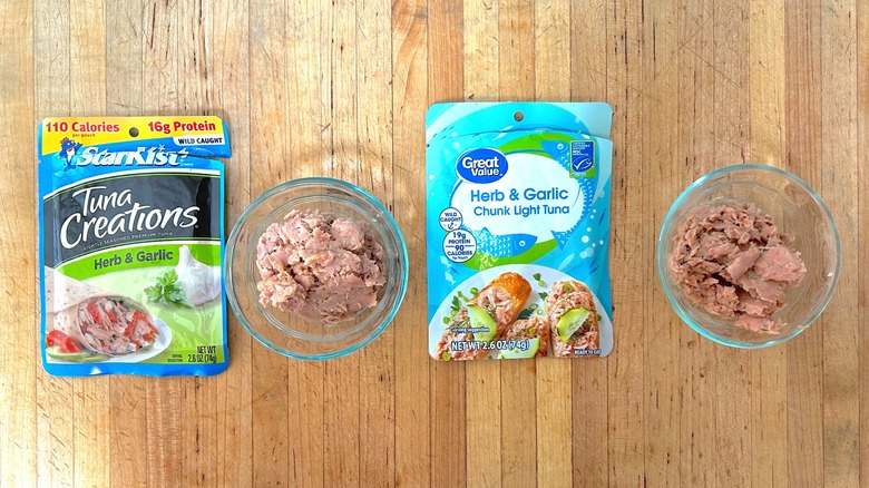 The Herb & Garlic-flavored tuna was the next variety I sampled from both the StarKist and Great Value brands. Nutritionally, the Great Value offering excelled on all fronts. It had fewer calories, less fat, lower sodium levels, and more protein than the StarKist variety for the same 2.6-ounce serving. Because of the texture of this tuna, it was difficult to assess the moisture levels in the packets, but I'd argue that it was higher in the StarKist one.