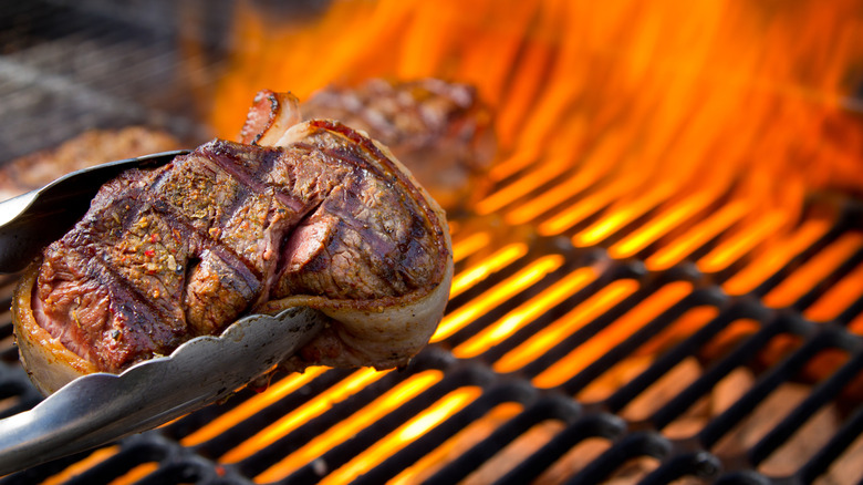 Stabbing prongs into a cut of meat encourages moisture loss which creates a dry, juiceless result. It's tempting to use a fork or other pronged tool to flip meat, but it should be avoided in favor of allowing the meat to rest after cooking. Ten minutes is all it takes for freshly-grilled meat to absorb the juices that would have been lost to a fork, and you'll be grateful you used tongs to flip.