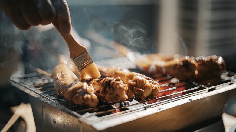 Anything with a high sugar content like brown sugar, honey, cane sugar, teriyaki, or sugar-heavy BBQ sauce runs the risk of burning when introduced to high heat. The best way to negate this is by applying sauces toward the end of cooking. You can also cook food on the indirect heat side of the grill while basting, which is a grillmaster's best friend. This ensures meat won't leave the grill burnt with all that flavor lost. Thinner marinades and brines can cause flare-ups, which burn food and cause inconsistent heating. The simple solution is to wipe off extra brine before putting food on the grill.