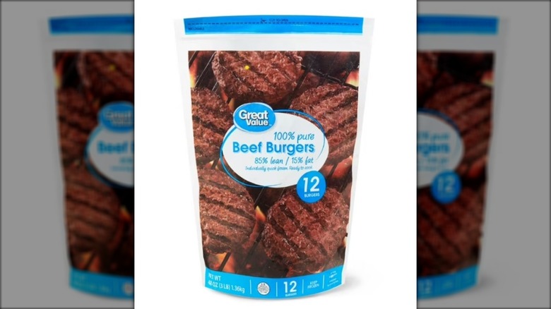 Walmart's low-cost store brand, Great Value, offers loads of good-quality foods, and it's a big mistake to assume they're inferior. That includes its 100% pure beef burgers. These patties are available in a 3-pound bag and have an uncommon lean-to-fat ratio of 85%/15%, making them a bit leaner than some of the other brands we've featured here. Because Great Value quick-freezes the patties individually, these pre-made burgers don't stick together in the package, making it easier to grab a couple for an easy weekday meal.