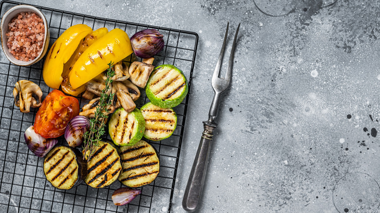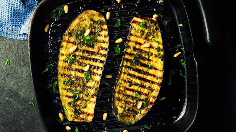 Cutting the eggplant on the thicker side will also help with this, and gives it more space to absorb the seasonings with which it's prepped. It can also be cut into ½-inch strips, and doing so can even help with grill marks. This vegetable might not seem all that impressive, but with a little salt and some 90-degree turns on the grill, it'll look like a five-star dish.