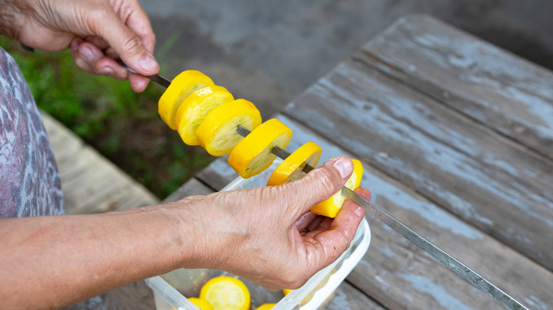 The cut of the zucchini also matters when it comes to maintaining the integrity of its shape. As aesthetic as thin slices look, you'll have better luck with thick-cut slices. Half-inch slices or medium to large dices hold up well when grilling. Pro tip: In my experience, zucchini rounds are the way to go because they're easy to cut, and you can slice them slightly thicker than a half-inch because they're smaller.