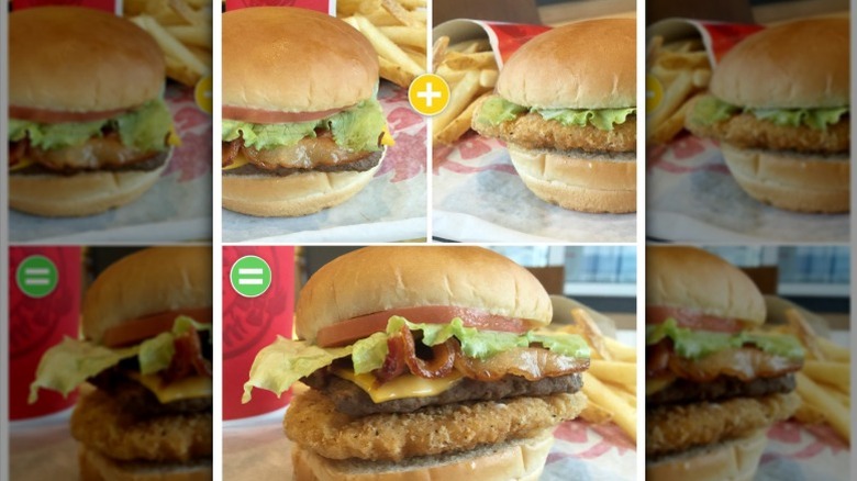 Okay, we'll admit it. It's cheating —just a little — to include this one, since it also involves a beef patty and bacon. But is not the chicken an equally important part of the barnyard burger? Employees should know this not-so-secret item, but just in case: order a chicken sandwich of your choice and a burger of your choice, then add the chicken to the burger. Just make sure one of those sandwiches has bacon — it's not a barnyard without pork. We recommend asking for a Jr. Bacon Cheeseburger, which features the burger patty, cheese bacon, lettuce, tomato, and mayo. Then, order a Crispy Chicken Sandwich, an appropriately minimalist item with chicken, lettuce, and mayo. Finally, remove the chicken patty from its home sandwich and shove it under the burger.