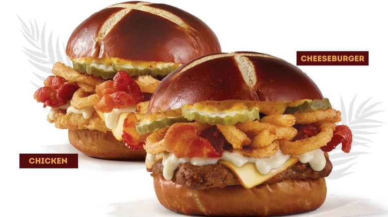 Wendy's will often have pretzel buns available for limited time offer items. Even if the special item is a burger, guess what? You can totally ask for a pretzel bun to hold any chicken sandwich. The pretzel bun is usually seasonal around September and October, so look to use this hack around the same time you start craving pumpkin spice lattes. Previously, Wendy's has carried items like the Pretzel Pub Chicken Sandwich, which comes with a savory beer cheese sauce. However, if you'd prefer your favorite sandwich — say, a Spicy Asiago Ranch Club or Ghost Pepper Ranch Chicken Sandwich— to have a pretzel bun, simply ask to upgrade the bun.