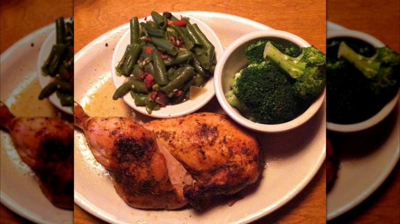 It's fair to say that most people don't think of Texas Roadhouse as a place to get roast chicken. However, once upon a time, you could do just that. The Oven Roasted Half Chicken at Texas Roadhouse was a way to get a serious hit of protein in one go, and came smothered in BBQ flavors that corresponded well to the restaurant's main output. This was a popular item during the 2010s, and was served up in a ribs combo, as well as on its own.