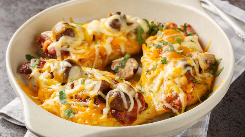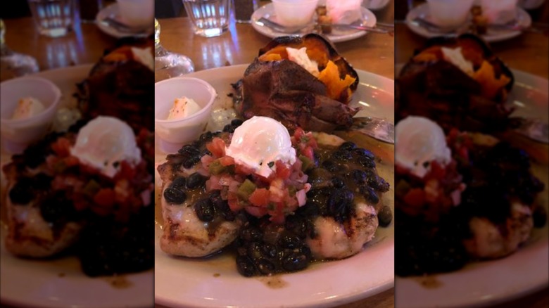 Although Texas Roadhouse is best-known for its steaks, that doesn't mean that chicken isn't on the menu. The restaurant has a vast array of chicken dishes, and it hasn't been afraid to spice things up in the decades it's been open. One way it's done this is with its Southwest Chicken, which was on its menu back in the 2010s and which gave diners a pretty hefty meal. This dish consisted of two individual chicken breasts that were seared to perfection and maximum flavor, and then topped with a portion of smooth, creamy black beans. A pico de gallo then topped the beans, and the whole thing was crowned with an ice cream scoop of sour cream. Look, we never said this was a healthy option, people.