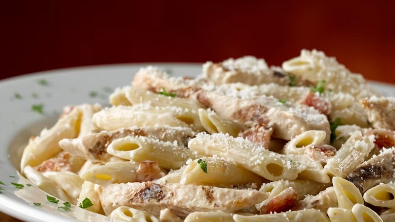 Once upon a time, Texas Roadhouse was the place to go for pasta. Well, that may not be entirely true — we'd bet that there are a few other restaurants that do pasta better — but if one of your friends wanted steak and another wanted creamy penne, it was a good middle ground. One of its flagship pasta dishes was the Sierra Chicken Pasta, a dish which wouldn't have been out of place at a Cheesecake Factory or Olive Garden. This pasta took pieces of penne and combined them with bacon and slices of grilled chicken, and then tossed it all in a rich, Asiago-based cheese sauce. The dish was then scattered with some fresh parsley and a sprinkling of parmesan cheese (because how could you not add this to any pasta dish?).