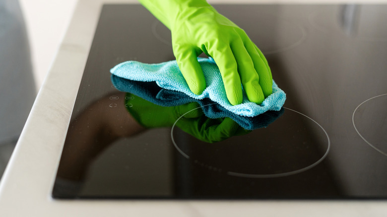 Here, it is crucial to remember that if there's an excess amount of dirt buildup on your glass stovetop along with those burnt bits, it is better to first clean the stovetop thoroughly, then move on to applying olive oil. A common mistake to avoid when cleaning a glass stovetop is using special chemical-based cleaners. Sure, they do the job, but some of the chemical residues can remain on the surface, and when you switch the stove on, they can release toxic fumes. So, instead, use water and a small amount of dish soap to get rid of the dirt buildup. Once that's done, you can remove the remaining burnt bits with olive oil and a cloth. What's more, once you're done cleaning the burnt food residue, you can also apply a thin layer of olive onto the surface of the stove, around the burners, to prevent water marks and streaks.