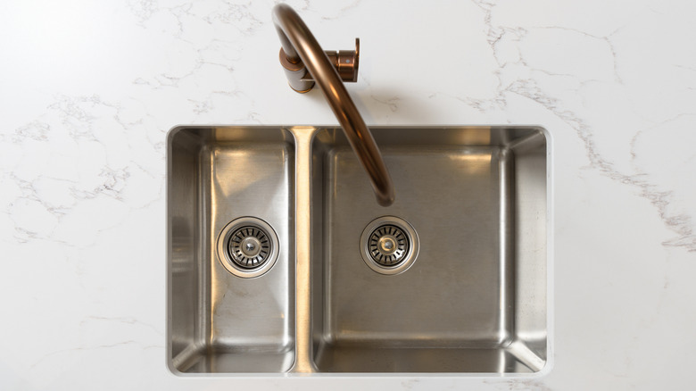 For that, too, you can go for a natural, homemade cleaner made with baking soda and vinegar, which is a highly popular way to clean stainless steel sinks. Once you're done cleaning with the baking soda and vinegar solution, you can wipe the surface of your sink and countertop down with a cloth that's lightly coated with some olive oil to prevent further smudges and streaks.