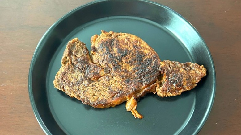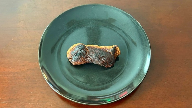 When I sat down to eat this steak, it had a light charred grill smell with heavier notes of Outback's signature 17-spice blend — that blend offers a complex smell and taste I love, with notes of sweet, spicy, and salty all rolled into one. There was a good sear on this cut, but a long piece of grizzly fat running through the middle made it challenging to eat — and that grizzle paired with a mild toughness gave it a rougher texture I don't care for in my steaks.