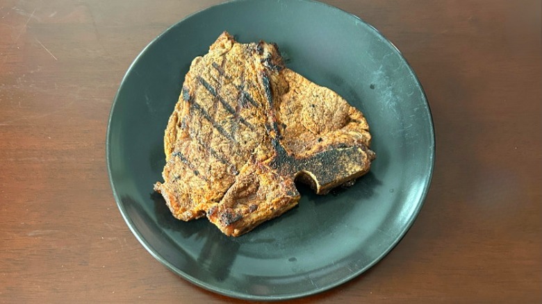 While a porterhouse steak looks similar to a T-bone, it's not really the same thing. However, if you enjoy a double-cut steak like the T-bone, this could be your next go-to menu item at Outback Steakhouse. The smell was a strong signature seasoning with a heavier char scent than other options on this list, layered over a deep umami flavor profile. Every bite was evenly cooked and juicy, with the outer layer of fat being soft rather than chewy — which is something I often run into when ordering steak from a restaurant. The steak was tender and thick, which really helped amp up the textural experience. Although it's not the top-ranking steak, the Melbourne porterhouse was delicious and I can definitely recommend it.