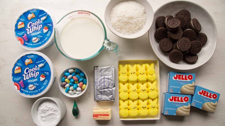 For this recipe, you'll need a pack of Oreos, butter (softened), cream cheese (softened), powdered sugar, milk, coconut cream instant pudding, and whipped topping. Then, get shredded coconut (sweetened or unsweetened), green food coloring, and assorted Easter candy such as Peeps, egg-shaped chocolates, etc.