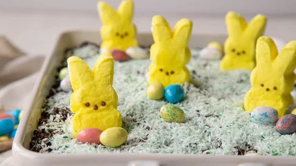 Much like a classic dirt cake, this recipe incorporates crushed Oreos, but a layer of coconutty creaminess and a few bright pops of color make it stand out. "We are big Oreo fans at my house, and this was a smash hit with my family," Shungu raves and adds, "Coconut lovers especially will enjoy this rendition with both coconut cream flavored pudding and shredded coconut on top." Let the kids help you garnish this dazzling dish with their favorite Easter candy, like Peeps and Mini Eggs, and this dessert is as easy and fun to make as it is to eat.
