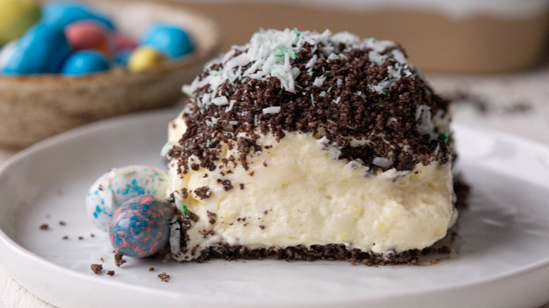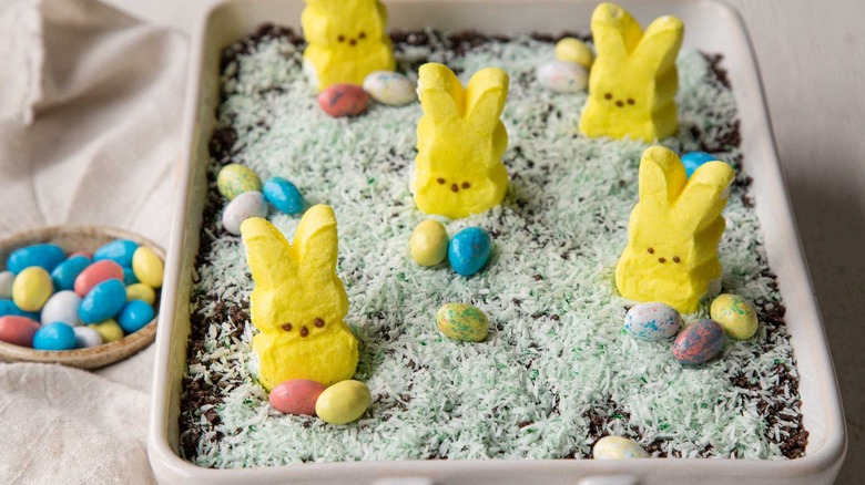 If you're the kind of person who goes big on holidays, chances are you love making festive seasonally appropriate recipes. Easter celebrations tend to be all about bright colors, candy, and cute animals, so it's only fitting that your dessert should conjure up all the joy of an early morning Easter egg hunt. Daily Meal recipe developer Kate Shungu shares this celebration Easter dirt cake recipe that will bring more than a touch of joy to the occasion. Whether you're planning brunch or a traditional Easter dinner, this sweet treat will appeal to guests of all ages.