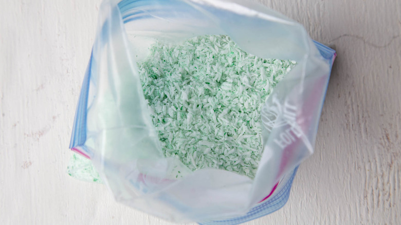 - Place the coconut and food coloring in a large resealable bag. Toss gently to combine.