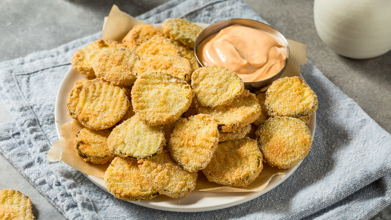 There are a number of batter options for pickles, ranging from a classic beer batter to cornmeal to panko breadcrumbs. You can also use more unconventional breading ingredients, like crushed crackers or cereal, but the key is to make sure you pat the pickles dry so that whatever batter you use will adhere to them. If you want to fry them without the mess of a ton of oil, try popping pickles in the air fryer for off the charts crunch. And, whatever you do, don't forget the dipping sauce!