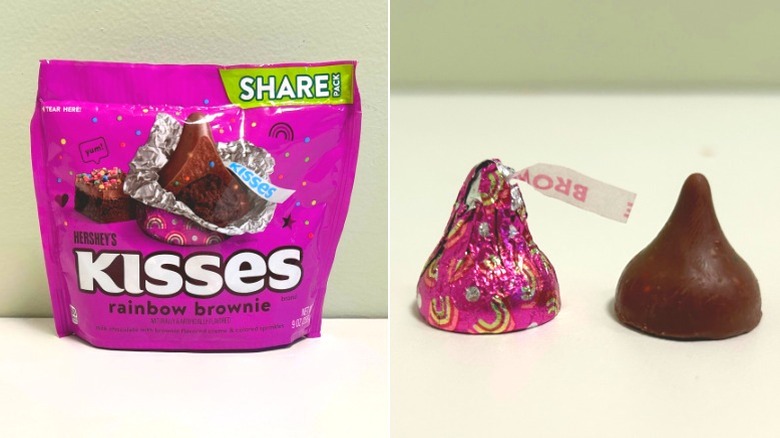 Trying the Hershey's Kisses Rainbow Brownie flavor was a bit of a wild ride, to be perfectly honest, and while I was totally here for some of it, I wanted to hop off other parts. It had a great start with a light rainbow brownie smell as soon as you opened the bag. Each little wrapped Kiss smelled delightful on its own, and the first few seconds of the taste test were downright euphoric. The chocolate here was superb with the smoothest texture that allowed for almost immediate melting in my mouth — honestly, it was like a hybrid between creamy pudding and traditional Hershey's milk chocolate. This creaminess was perfectly balanced with an occasional light crunch.