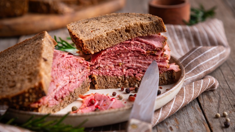 Corned beef is all too often mistaken for pastrami because they're both made from brisket. The difference happens during the preparation of each, which is also incredibly specific to the deli serving these meats. Corned beef is brined, usually with a pickling spice, before it's boiled. This pickling spice is partially responsible for the diverse flavor of corned beef from the deli vs corned beef straight from a package. Each deli has its own spice blend, which usually consists of peppercorns, mustard seed, allspice, and bay leaves. Some delis add cloves, cardamom, flavored salt, or mixed peppercorns for depth. The beautiful thing about ordering corned beef from a deli is the reassurance that each slice is infused with scratch-made seasoning, and has been brined recently to infuse the most flavor possible.