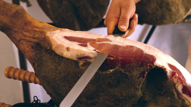 The beauty of prosciutto lies in the ham leg from which it's sliced. If you've never seen prosciutto sliced off the bone before, then it's probably time to find a new deli. This is Prosciutto di Parma, and it's the most traditionally imported prosciutto for delis. Even this has seen an uptick, as the demand for authentic prosciutto has skyrocketed. Some delis may even import a leg of prosciutto sans femur, which allows it to be easily sliced on a slicer. These slices will be thin enough to see through, which is how the meat is intended to be eaten. Any thicker, and the texture becomes unpleasant and chewy. Each slice should be equally lean and marbled, and, yes — this is what makes the aged pork such an expensive cold cut.