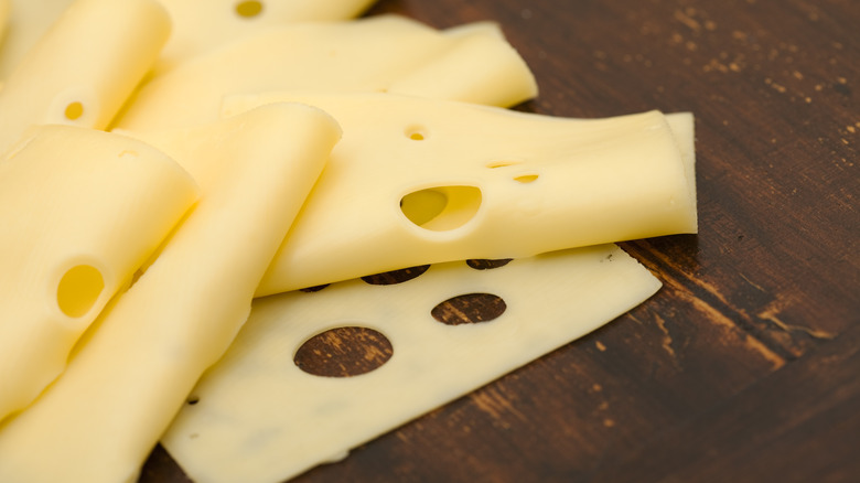 Let's talk about the process of making Swiss cheese. As its name implies, it's an Alpine-style cheese that's traditionally low in salt and heavy in brine. Its lower salt content is what allows the potent earthiness of Swiss to stand out, rather than a salty forefront like with many other cheeses. The result? A cheese that loves (good) bacteria, which releases carbon dioxide bubbles, creating the classic hole-y cheese we're familiar with. This authentic Swiss is what you'll find in most delis, with a strong flavor and an even stronger scent. Even Boar's Head offers an imported version of this cheese that's traditionally low in salt and high in flavor.