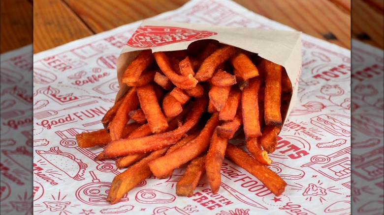 All of the sides and shareables are gluten-free at Hat Creek Burger Company, and you may be happy to learn that there are multiple fried potato options. Choose from french fries, tater tots, and their loaded varieties with cheddar cheese, bacon, and ranch dressing. Sweet potato fries are also an option, which the chain touts as a healthier alternative to the classic favorite. If the secret spice blend doesn't add enough flavor, you can dip your fries in any of the restaurant's dressings and sauces — they're all gluten-free, too. Just be aware that other items in the Hat Creek kitchens contain gluten, so let the staff know about your allergy so that they can minimize cross-contact by taking extra precautions.