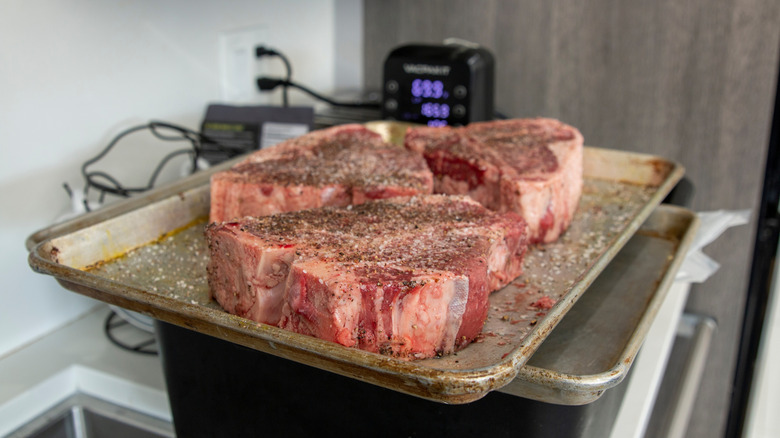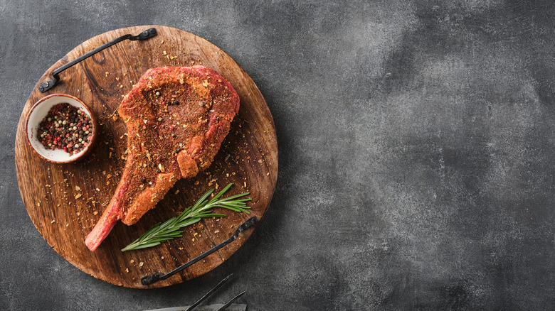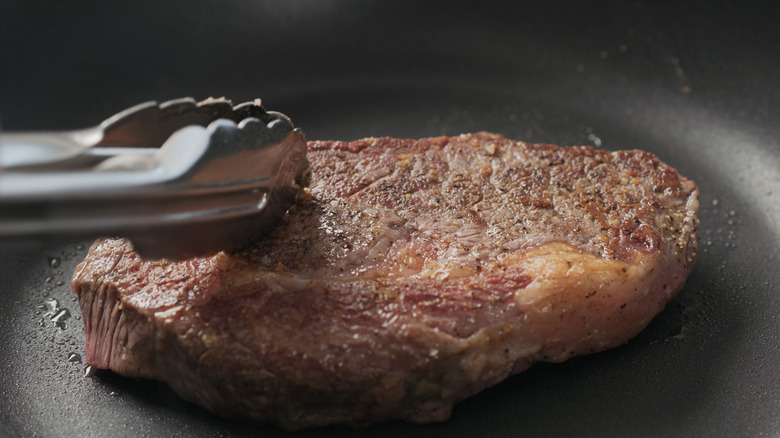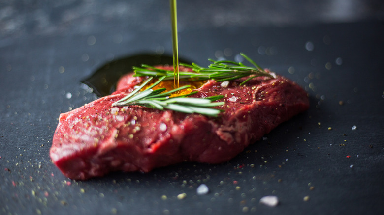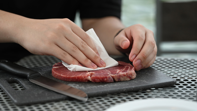 Another big faux pas that can make or break an oven-cooked steak is not patting it dry before preparing it. While it may seem like this is an unnecessary step, tossing a moist steak into a pan or oven can slow down the cooking process, steam the meat, and prevent the Maillard reaction from occurring, which means you'll have a tough, flavorless piece of steak. This is especially important when marinating, where there will be excess moisture added to the meat.