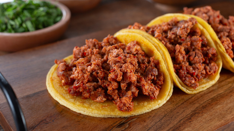 When we think of spice in tacos, we tend to think that it comes from a few different places: our seasoning mix, our salsa, and our sliced jalapeños. However, there's another source of spice that you probably haven't considered. Adding chorizo to tacos can make for the best meal ever, thanks to its ability to give them not just deep, rich, spicy flavors but a fantastic boost to the texture of your ground beef.