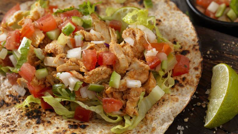 Instead, think outside the box. "Salsa and guacamole are great, but look to mix it up with fresh radish, chicharrones, or pickled onion," says Lauro Romero, King Tide Fish and Shell's executive chef (via Outside). "A fresh, warm tortilla is made better by a crunchy counterpart." A freshly made slaw can also be a good option, as it provides both crispiness and acidity, as well as a lightness that can balance out the intensity of your meat. If you don't have chicharrones on hand, you can create crunch out of some store cupboard staples. Try crushing up some potato chips or croutons and sprinkling them onto your taco, or scattering on some crispy fried onions. The latter will also add an intense, bassy fragrance and pop of umami that's very welcome.