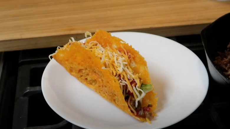 The Cheesy Gordita Crunch is a thing of beauty — a taco wrapped in a soft tortilla with a thick layer of cheese between the two. When chomped into, you get crispiness, softness, and gooeyness in one fell swoop, as well as a serious punch of flavor. However, real taco aficionados know that if you're smart enough, you only need one of those things to make a premium shell: the cheese. With a genius cheese hack, you can make a taco shell out of melted cheddar, giving your tacos a serious pop of umami while still maintaining their crunch.