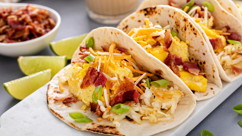 Breakfast tacos always need eggs — but they usually go inside, right? Well, yes, but they don't have to. If you're bored of housing your eggs in a flour tortilla for your morning taco, take a leap of faith and give them the ultimate upgrade with an egg hack. Beat your eggs, pour them into a pan, and cook them into a thin, small omelet, flipping halfway through to ensure that it's fully solid on both sides. Then, use this omelet as a taco shell, loading your bacon, sausage, and hash browns into it. You get all of the flavor, none of the flour, and you keep your breakfast keto-friendly and high-protein. How good is that?