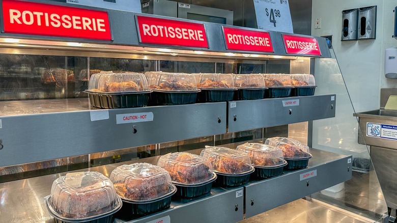 Picking up a rotisserie chicken from the grocery store can be the best part of your day. With one quick tap of your card, you can take home a ready-cooked source of protein, bursting with flavor and ready to shred and put in your favorite meals. Sounds like an idyllic image, until you actually get to your local store, and see the state of the rotisserie chickens on display. If you time it right, the best rotisserie chickens will be plump, juicy, and bursting with freshness — but turn up late, and you'll be met with dry, desiccated carcasses that have been sitting under the heat lamp for hours. That's hardly what anyone wants.