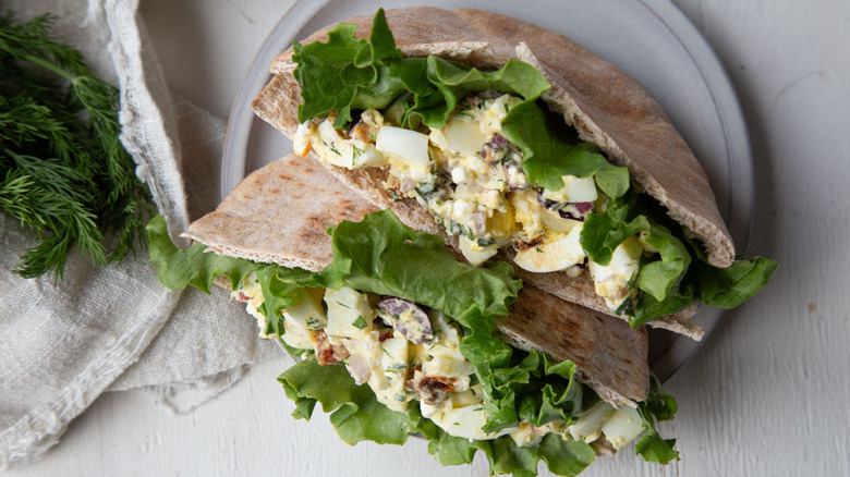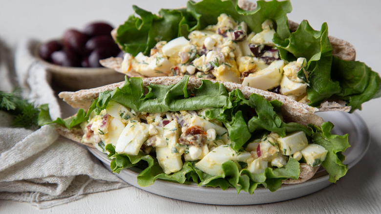- Serve the egg salad on its own, or on pita with green leaf lettuce
