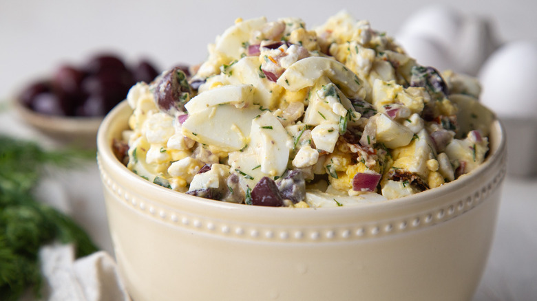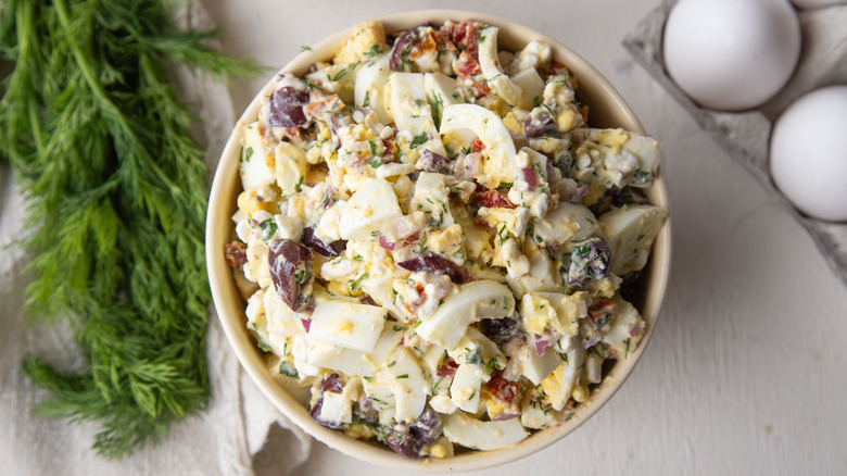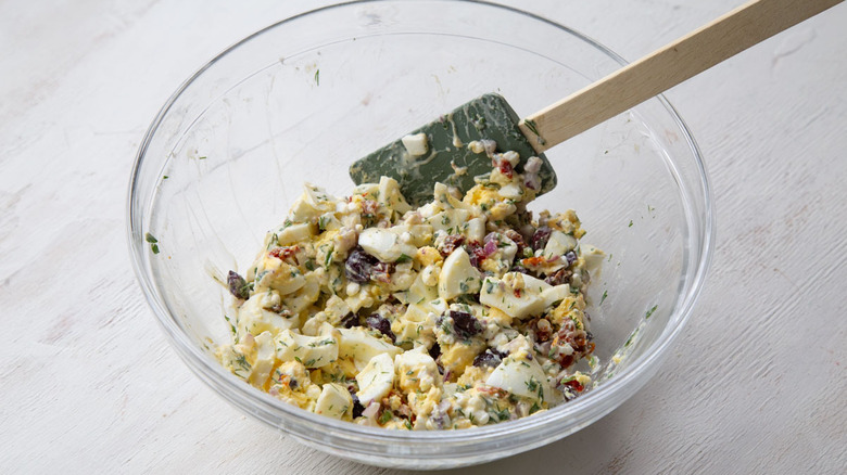 Plain egg salad, made from nothing more than boiled eggs and mayonnaise, is a relatively inexpensive source of protein (depending on the price of eggs), and it's also a great way to use up your Easter leftovers. Still, it can get kind of boring after a sandwich or two, so many home cooks like to add extra ingredients to their egg salad. Here developer Kate Shungu is going with a Mediterranean-inspired flavor profile, using red onions for crunch supplemented by kalamata olives and sun-dried tomatoes. As a bonus, she stirs in some cottage cheese to provide yet more protein.
