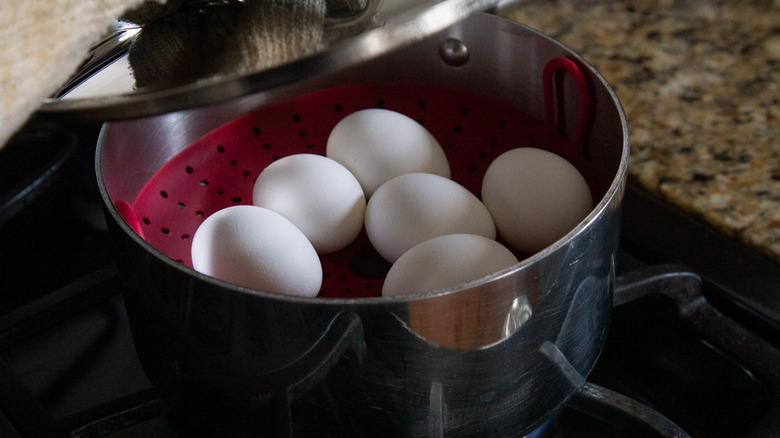 The reason steamed eggs tend to be easier to peel than their boiled counterparts is because the steam is able to penetrate the shells to some extent. This helps to loosen them up so they slip off without too much chipping. Steaming also allows for gentler and more even cooking than boiling water. What can you do if you don't have a steamer basket, though? In this case, you can utilize a sort of semi-steam technique where you put the eggs in a pot filled with half an inch of boiling water, then cover the pot and proceed as per the recipe.