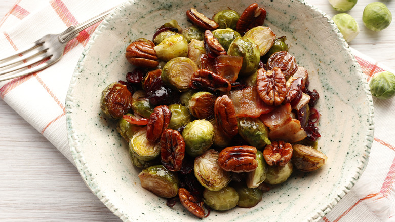 While many people rely on tossing roasted Brussels sprouts with crispy bacon, Wood prefers another ingredient. "In our restaurants," Wood shares with us, "we add toasted almonds to add texture and depth of flavor." Other crispy toppings to try include toasted pecans or pumpkin seeds.