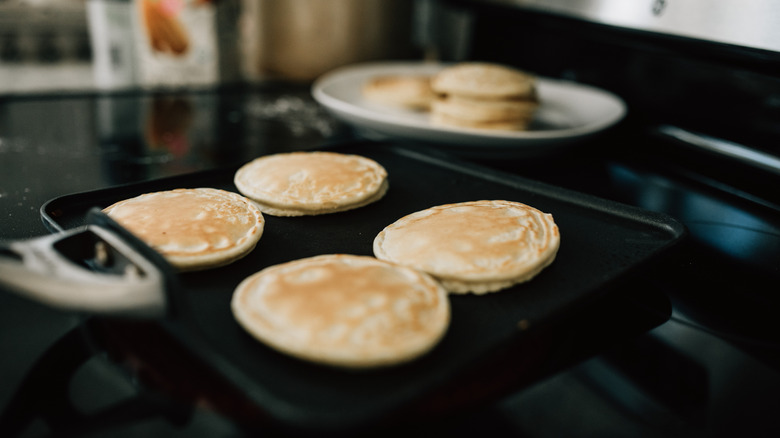 Before you can add the batter, you need to ensure you're using the best pan for the job. Bedford suggests going with a non-stick option, whether it's a pan or a griddle. He says, "A good non-stick surface reduces the need for excessive oil or butter, minimizing splattering. If you prefer a bit of oil or butter for flavor, use a small amount and spread it thinly." And when it comes to choosing between butter or oil, we think it's time to start making pancakes with coconut oil.