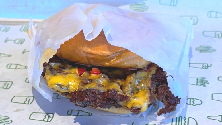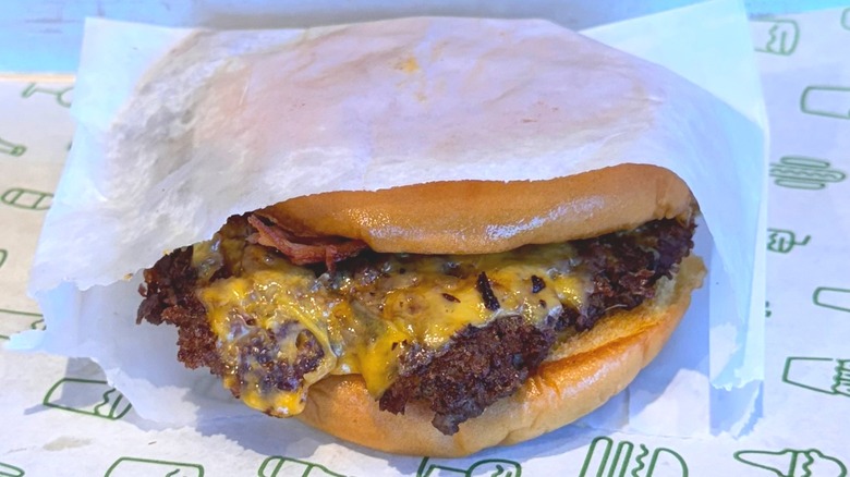 I really need to start paying more attention before I take my bites because I was not ready for the Smoke Shack burger. This one features the brand's signature patty with American cheese, applewood-smoked bacon, chopped cherry peppers, and ShackSauce on a toasted potato bun. Between the cherry peppers and whatever was in that sauce, my mouth was on fire!